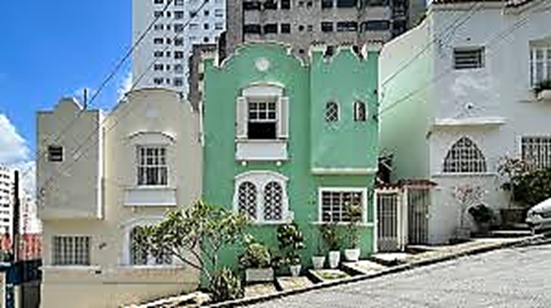Casinhas geminadas em uma rua de São Paulo – em segundo plano os germes de sua destruição.