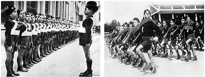 É interessante que o mesmo processo – o uso da infância para fixar um modo de vida, uma visão de mundo – pode e foi utilizado com objetivos completamente opostos. Retrocedendo por exatamente cem anos chegamos à Italia Fascista; o cuidado que o Regime dedicava à educação escolar e esportiva, com o objetivo de difundir seus ideais na sociedade começando com os jovens, era extremo. Assim, meninos com seis – oito anos de idade, uniformizados e portanto um fuzil de madeira, se exercitavam na escola e desfilavam nas datas nacionais; eram ‘os filhos da loba”. Não entendiam nada do que estava acontecendo e intenso era o trabalho de instrutores militares para conseguir mantê-los em confusa formação. Dos oito aos quatorze eram enquadrados como “Balilla”; esportes, desfiles, acampamentos ao ar livre, exercícios de tiro com armas reais e balas de festim – essas eram atividades que visavam a construção de uma geração patriótica, militarista e corajosa, cuja formação ideológica fascista continuava até a universidade.
