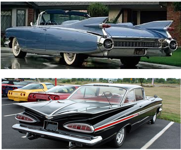 É essa a sociedade que Detroit passa a alimentar com veículos cada vez mais irracionais, fiando-se no imperativo psicológico que diz que ‘os objetos são objetos de desejo, não de uso’. Se o automóvel dos anos ´20 exibia roupagem sóbria, aristocrática, própria para uma elite habituada ao luxo – mansões, iates, viagens, etc. o automóvel dos anos ´50 destinava-se à uma classe média, moradora de quase indistinguíveis subúrbios, extremamente homogênea em moda, ideias e aspirações e principalmente desprovida de gosto estético, portanto fácil presa de manipulações marqueteiras. E a indústria o que faz? Lhe empurra monstros enormes, extremamente cafonas, kirsch até, e superficialmente chamativos. São carros que utilizam motores V8 de tamanhos próximos aos 5 ou 6 litros, obrigatórios para empurrar as enormes e pesadas carrocerias em voga; em média cada carro trazia cerca de 25 a 40 kg de cromados com nenhuma função prática. A seguir, dois exemplos de: (i) luxo extremo; (ii) carro destinado à classe média – e mesmo este exibe formas exageradas: