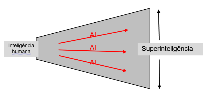 Esquema da evolução para superinteligência. As setas simulam o processo chamado “argumento para aceleração”, que é o efeito de retroalimentação que a AI pode fazer para seu próprio desenvolvimento. A figura foi reproduzida do meu post “Neurônios versus transistors”, e adaptação ao presente tema pede substituição da ‘inteligência humana ‘para’ inteligência nível IAGen’.
