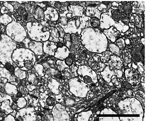 Micrografia eletrônica de transmissão de cérebro humano mostrando várias sinapses. [Barra = 2 micra (0,002 mm). Fonte]